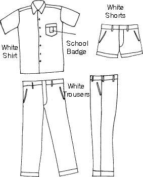 - Summer uniform : white open-neck shirt with buttons, except the first one, fastened up and with the school badge sewn on four sides onto the pocket, and white shorts or trousers.