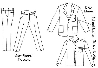 - Winter uniforms : a blue blazer with pocket badge, white shirt and school tie, and grey flannel trousers. Sweaters must be either grey or navy blue in colour. Fancy T-shirts and track suits are not allowed.
